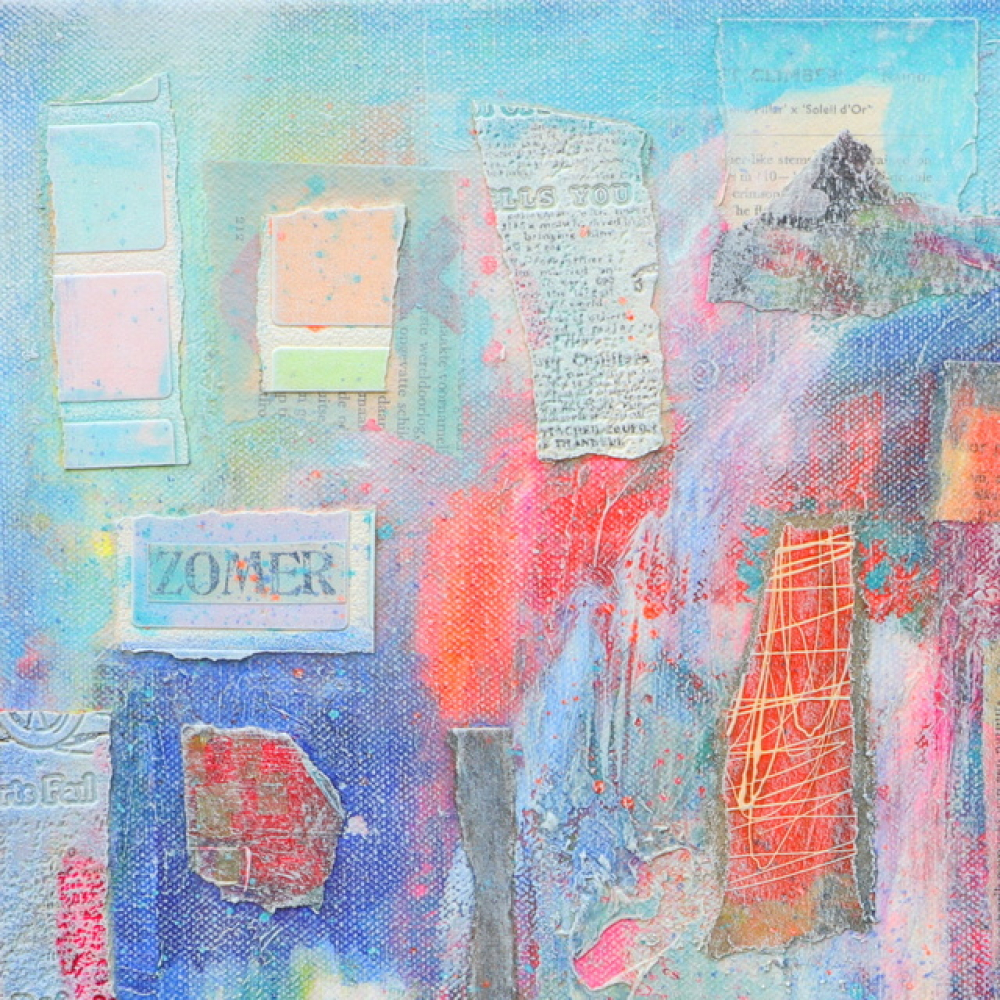 Abstract collage kunstwerk van 40 x 40 cm in pastelkleurige tinten blauw, roze en oranje.