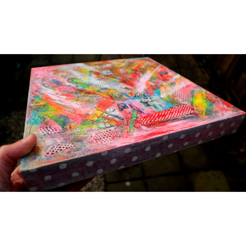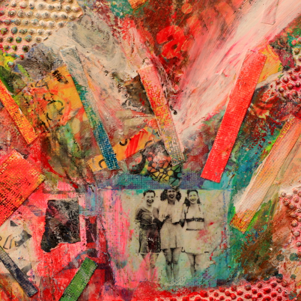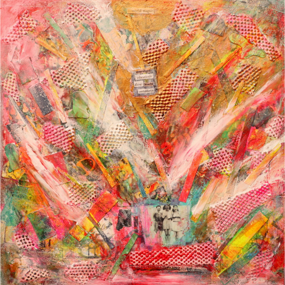 Good vibrations! Dit collage kunstwerk straalt het uit. Je ziet allerlei kleuren en het kunstwerk is één en al beweging die vanaf de vrolijke vrouwen uitstraalt naar buiten en van boven en van buitenaf veelvoudig naar hen terugkomt.