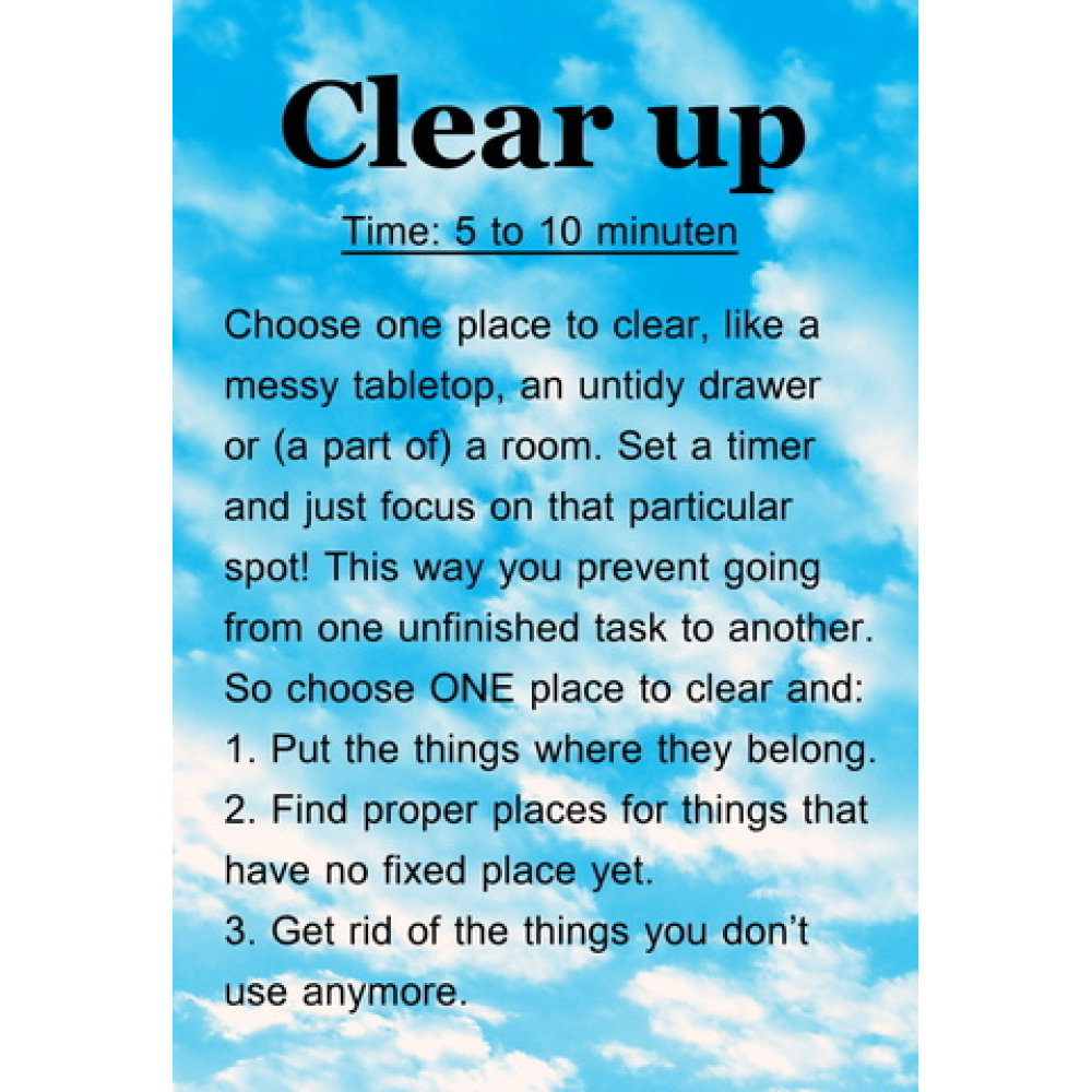 The practical assignments, tips and suggestions cost little time, appeal to your creativity and give room to a personal interpretation. The author herself has ADHD, which is reflected in the cards.