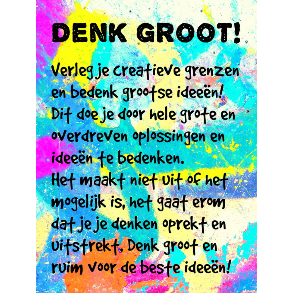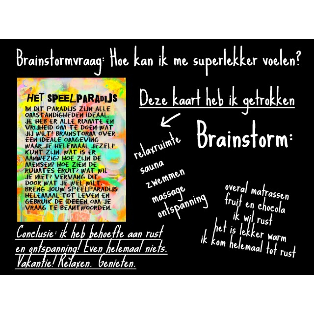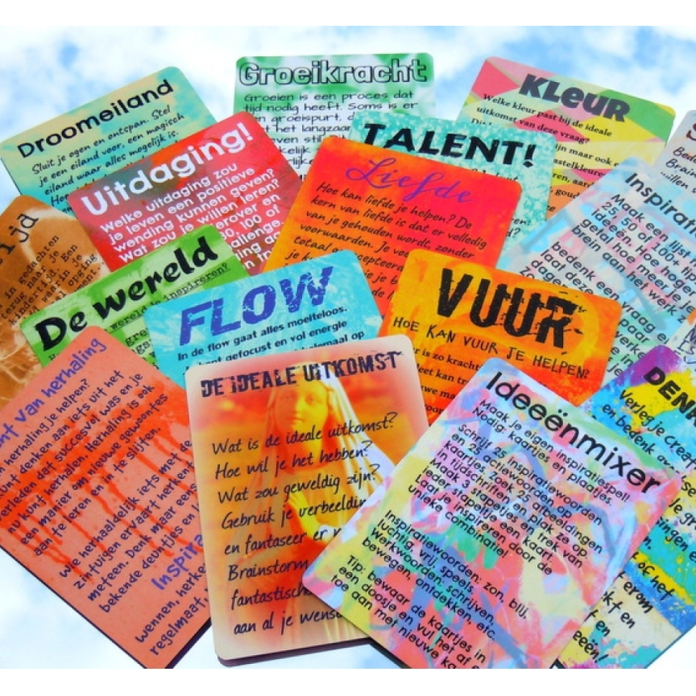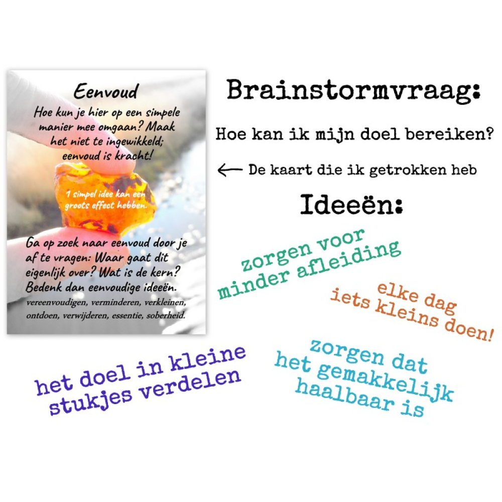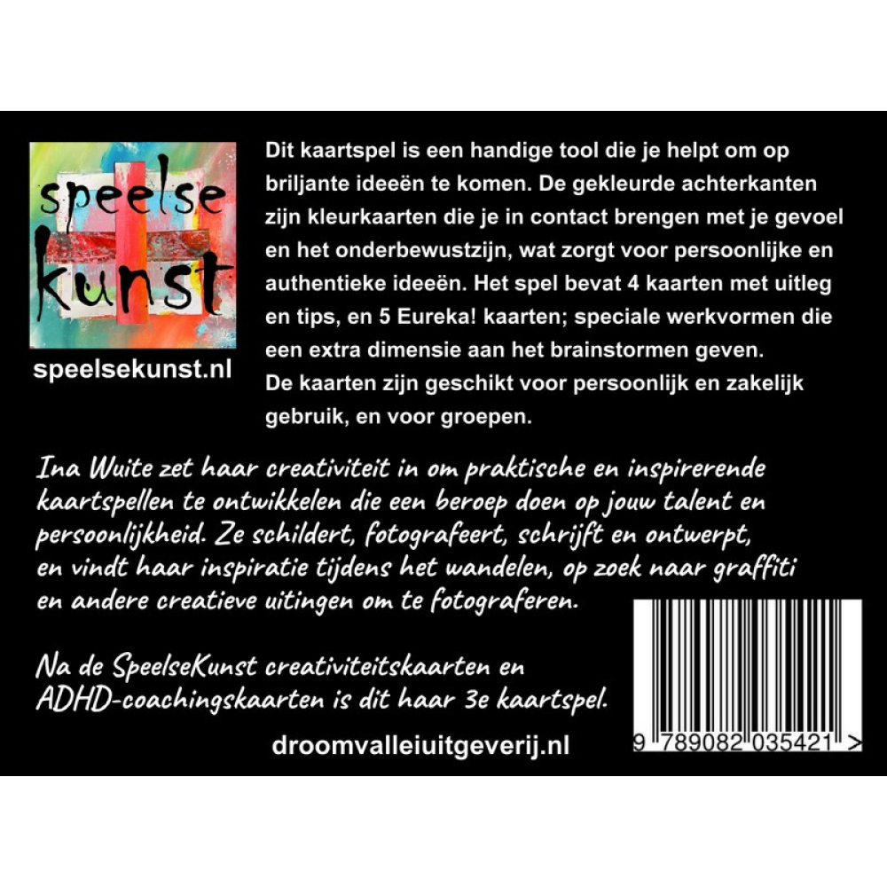 'SpeelseKunst Brainstormkaarten' helpen je om op briljante ideeën te komen. De gekleurde achterkanten zijn kleurkaarten die je in contact brengen met je gevoel en het onderbewustzijn, wat zorgt voor persoonlijke en authentieke ideeën. Het spel bevat 43 brainstormkaarten en kleurkaarten, 4 kaarten met uitleg en tips, en 5 Eureka! kaarten; speciale werkvormen die een extra dimensie aan het brainstormen geven.Het spel werkt eenvoudig: je stelt een open vraag, trekt een kaart en gaat brainstormen. De kaarten zijn gemakkelijk toepasbaar voor diverse doeleinden: brainstormsessies, persoonlijke vragen, het ontwikkelen van nieuwe producten en diensten, coaching, therapie etc.